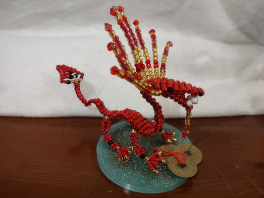 Beaded Red and Gold Dragon on Resin Stand with Three Lucky Chinese Coins