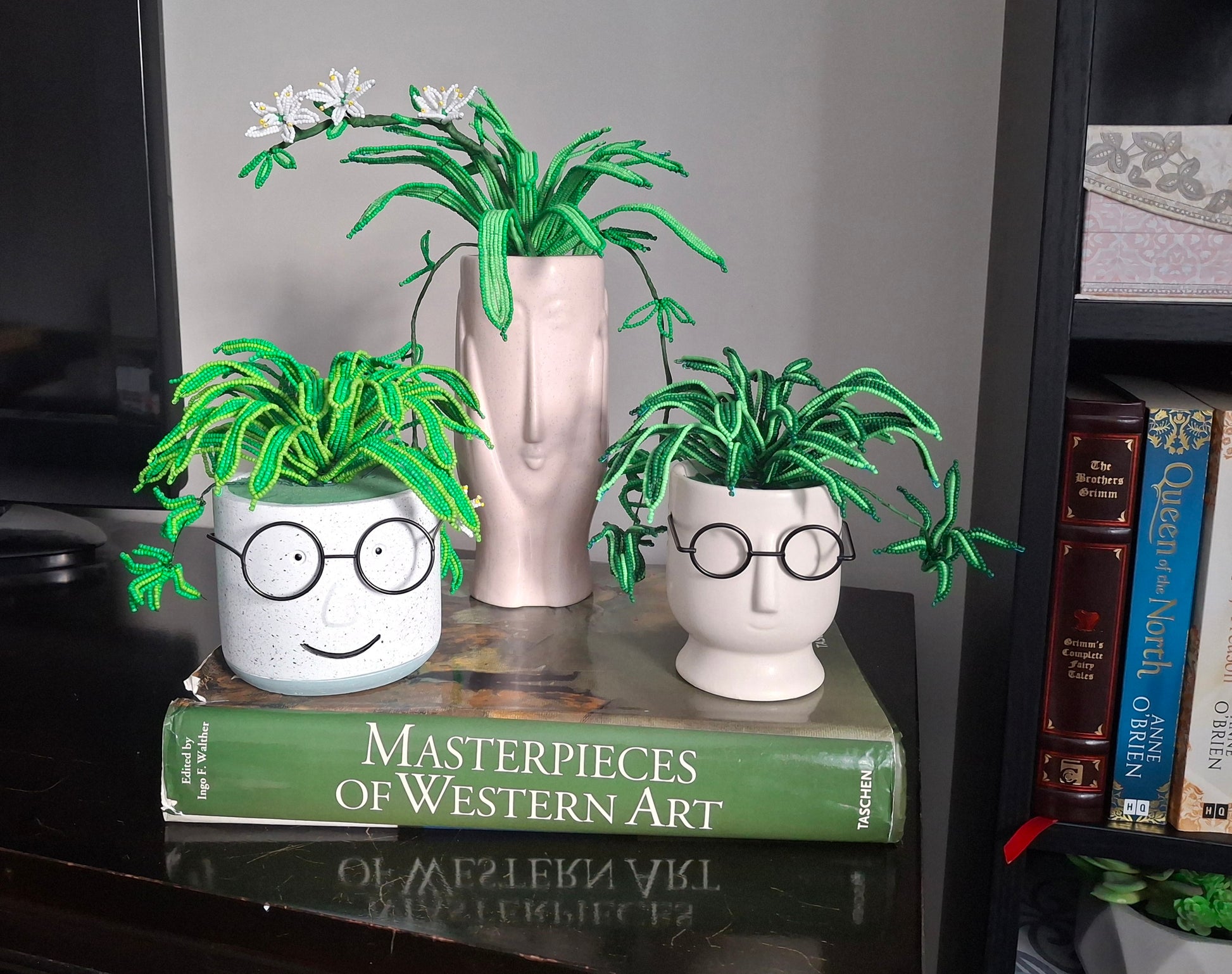 Bring elegance and a touch of whimsy to any space with our French-beaded spider plant in face planter. Perfect for bookshelves, mantels, or as a thoughtful gift, this timeless floral adds a touch of sophistication and warmth to your home.