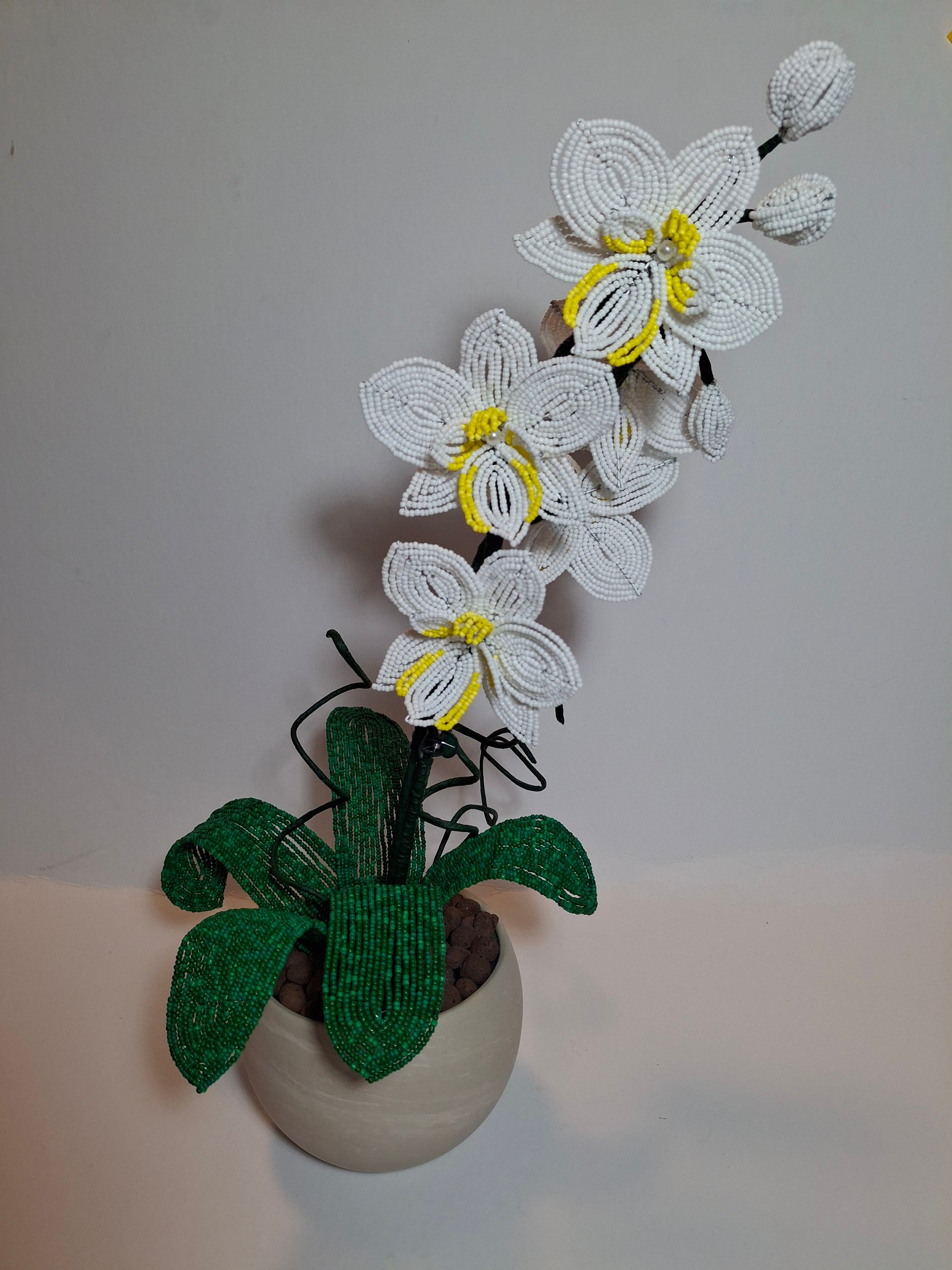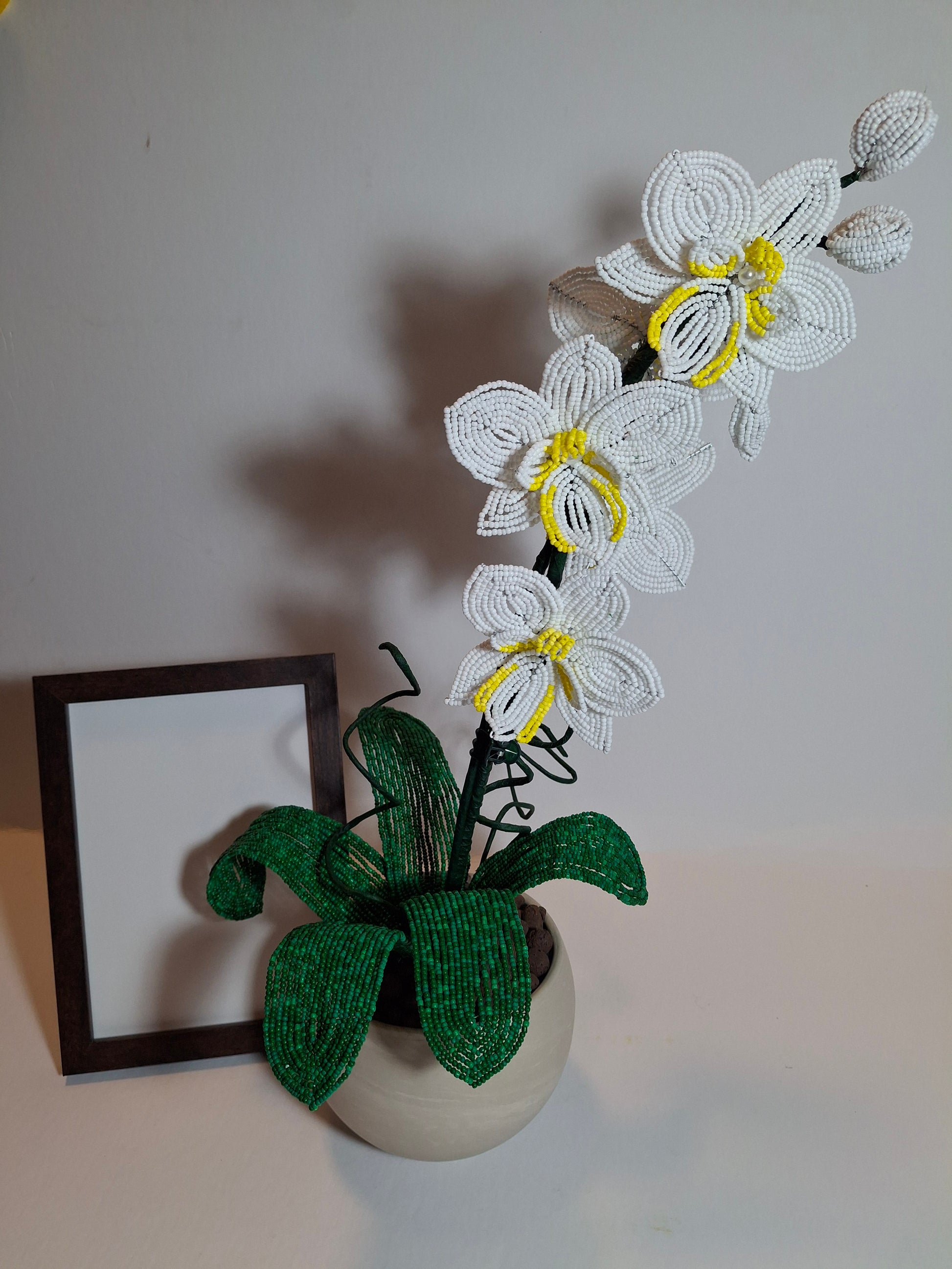 Bring elegance to any space with our French-beaded white orchid. Perfect for tabletops, mantels, or as a thoughtful gift, these maintenance-free, timeless florals add a touch of sophistication and warmth to your home.
